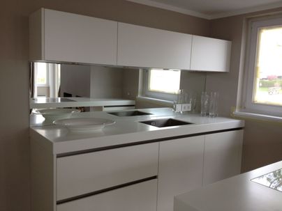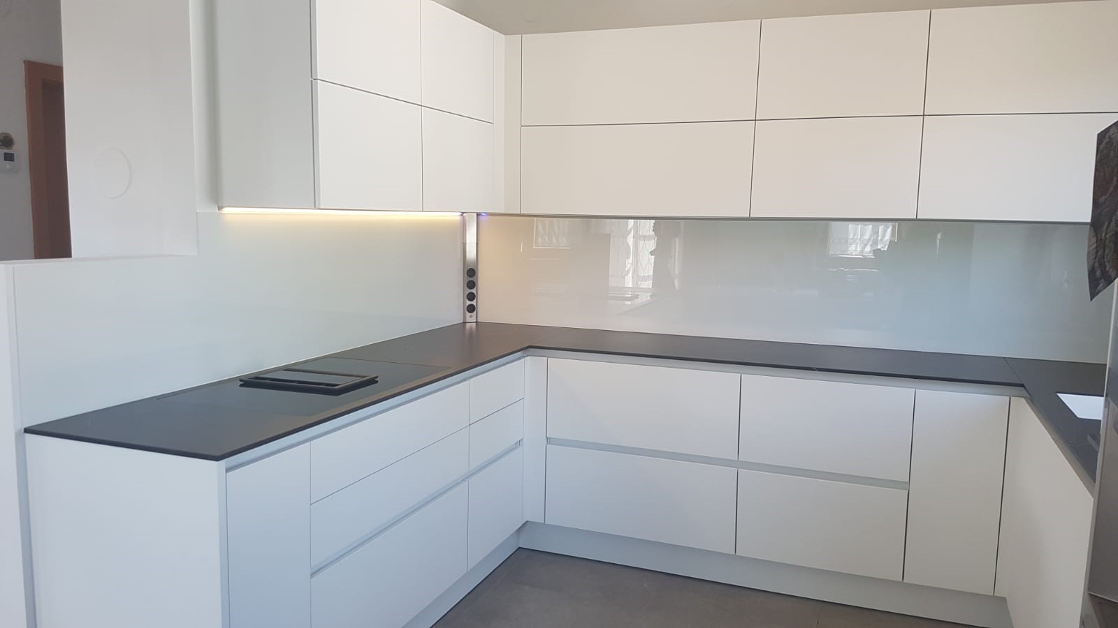 Jedes Glas wird von uns maßgefertigt, dabei können wir das Glas so zuschneiden, dass es exakt zu Ihren Steckdosen, Dunstabzug, Oberschränken etc. passt.
